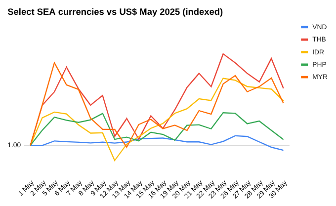 根据 DXY 指数,与 4 月份相比,5 月份美元下跌 0.82%,但兑越南盾上涨 0.68%据国家统计局称。这使得越南盾与大多数地区同行产生了分歧。