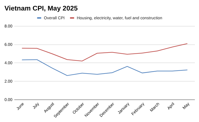 越南消费者价格指数上涨0.16% 5 月环比增长 3.24%,与去年 5 月相比增长 3.24%。