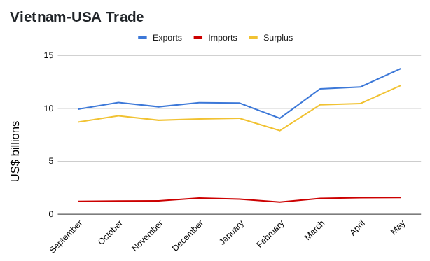 顺便说一下,这使得越南对美国的贸易顺差达到121.6亿美元,较4月份增长16.32%。